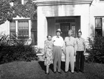 Family photograph taken during the promotion of Dean J. Thomas Davis to be "dean emeritus and professor" at John Tarleton College. Right to left, Mrs. J. Thomas. Davis, Dean J. Thomas Davis, Lieutenant Colonel Willson Davis (oldest son) and Wilson Davis Junior (oldest grandson). They are standing next to each other in the lawn with one of the campus buildings in the background. Published in the Fort Worth Star-Telegram morning edition, July 29, 1945.