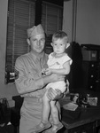 Luther M. Dove Junior, 20-month-old son of Sergeant Lutner M. Dove Senior, of the Fort Worth Army Air Field, was found having wandered away from home. He was spotted toddling along a railroad track intersecting White Settlement Road, by a passing motorist. He is shown in the sheriff's office, being carried by his father. Sergeant Dove is wearing his military uniform.