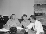 Private First Class Morris C. Reynolds, left, and Private First Class Martin C. Anderson, center, wounded veterans of the European campaign, are in Fort Worth, Texas, from McCloskey General Hospital. They are discussing plans with M. D. Mitchell, regional representative of the United States Railroad Retirement Board, for their participation in the recruiting of urgently-needed railroad workers. The three men are sitting around a desk. The veterans are wearing their military uniforms and Mr. Mitchell is wearing a collared shirt, necktie and trousers. On the desk is a box of files and a telephone.