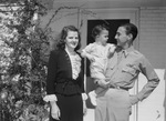 Captain Roy A. Westbrook Junior came home to Fort Worth, Texas, after completing a tour of duty as a "Hump" flier in the China Burma India Theater. The pilot is shown with his wife and their son, Roy A. Westbrook III, outside the home of Westbrook's sister, Mrs. Emory Cantey. Captain Westbrook is wearing his military uniform and is carrying his son, who is wearing a shirt and shorts. Mrs. Westbrook is wearing a blouse, blazer and skirt.