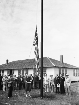 Flag raising ceremory at Hicks Field. Miss Gretchen Brants, daughter of Mr. and Mrs. Harry E. Braunt, shown hoisting the flag. At the left with the trumpet is Billy Stratton; at the right are five participants, left to right, Harry E. Brants, William Holden, Mayor T. J. Harrell, Major William F. Long and Major B. S. Graham. Fort Worth Star-Telegram Evening Edition. 1940-06-17. Photograph showing a crowd of people standing around a flag pole. A man and a woman are holding the rope hoisting the American flag up the pole. There is a building in the background.