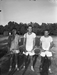 Left to right, W. E. Winters, Bill Robinson and Roger McKenzie. All three are wearing tennis uniforms and holding a tennis racket. They are posed, standing in front of a tennis court.