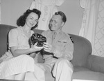Captain and Mrs. M. E. Brooks admire a rare cut-glass bowl, made of Bohemian red glass, which was presented to Captain Brooks by a lady in Pilsen, Czecho-Slovakia, in gratitude for the deliverance by Brooks' Army division of that nation from German troops. They are sitting on a couch, holding the bowl. Mrs. Brooks is wearing a striped dress. Captain Brooks is wearing his military uniform.