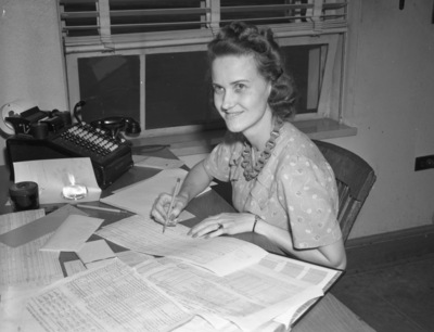 For the first time in the history of the United States Weather Bureau in Fort Worth, Texas, a woman employee adorns the office. The employee is Miss Elin Forsell, who has taken over the record work in the office. She is sitting at her desk, writing on a piece of paper with a pencil. Various documents are scattered on the desk, as well as a telephone and an adding machine. Miss Forsel is wearing a dress and a necklace.