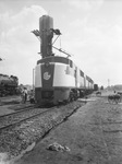 Front view of the two-unit 4,000-horse-power Diesel engine given a test run on the Sunshine Special by the Texas & Pacific Railway Company between Fort Worth and El Paso. The is a big Baldwin Locomotive Works (BLW) logo on the engine. A few men are gathered around the left side of the train. There is a prominent silo structure seen behind the train. Published in the Fort Worth Star-Telegram evening edition, August 1, 1945.