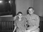 Colonel Walter G. Jennings, (right), 5th Corps ordnance officer, and his son, William, are equally happy over the father's return "home to Texas" from two years' service in North Africa and Europe. Colonel Jennings and his son are shown sitting on a bench. Colonel Jennings has his arm across his son's shoulders. Published in The Fort Worth Star-Telegram Evening Edition August 2, 1945