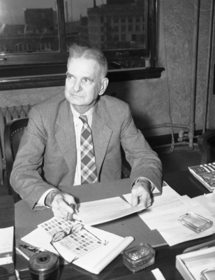 Brigadier General Charles W. Nimon, who was retired with the rank of brevet-major general after 50 years of service in the Texas National Guard and its predecessor military organizations. He is sitting at his at his desk in the Fort Worth Club Building. He is secretary of the Texas National Guard Armory Board, a civilian post which he will retain. He is wearing a suit and a plaid tie.