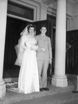 Lieutenant and Mrs. Richard H. Burke at the church steps during their wedding day. The bride is the former Miss Madeline Anne Ransom, daughter of Mr. and Mrs. H. B. Ransom.. She is wearing a silk wedding dress holding a dainty bouquet. Lieutenant Burke is in his uniform.