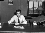 Winston Croslin is a veteran artist at the Fort Worth Star-Telegram. Mr. Croslin often works in conjunction with the engraving department. He is shown sitting at his desk, wearing a dress shirt with cuffed sleeves and a necktie. There is a name plate near the front of his desk. A slanted drawing table is in the background.