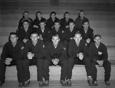 One of the most promising Texas Christian University basketball teams is preparing to kick off their 1940 season. The Frogs were winners in six out of ten practice games and hope to continue that hot streak against Rice this weekend. The team is shown posing in the bleachers wearing warm-up suits. They are left to right, on the first row Woodrow Duckworth, Leonard Cannaday, Captain Mac Best, Jack Billingsley, and Herman Hoover. On the second row are Guy Holt, Buddy Barron, Ralph Tankersley, Robert Groseclose, and Dennis Tankersley. On the third row are Trainer Albert Smith, L. A. Monroe, Bobby Childers, Ben Abney, and Coach Mike Brumbelow.