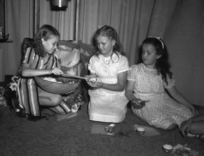 An international tea was given by the junior group of the Week-Day Bible School at the University Christian Church. The tea was dedicated to Mrs. Terry King, secretary emeritus of the Texas Mission work of the Christian Churches. The picture shows, left to right, Maria Harper, Peggy Jean Ragan and Marianne Oliver. They are sitting on the floor. Maria is serving Peggy some food out of a large bowl with a wooden spoon. Maria is wearing a striped dress. Peggy is wearing a dress with buttons down the bodice and ruffles on the collar and sleeves, and a necklace. Marianne is wearing a floral print dress. Mrs. H. V. Shank was in charge of the tea and Mrs. S. H. Jenkins is director of the school.