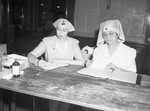 Red Cross workers. Mrs. Thomas West (left), clerical worker, and Mrs. W.C. Gholson (right), acting chairman of the Red Cross surgical dressings workroom of the Woman's Club. The two women are sitting at a wooden table that has various supplies on it. Mrs. West is writing something down in a book and Mrs. Gholson is reading through a binder of documents. The two women are dressed in Red Cross uniform, including hats that have the red cross logo.