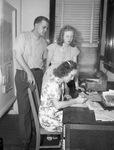 Miss Nelda Summers, standing, right, and R. M. Fisher, left, send messages through Mrs. Dan Greenwood, seated, home service worker of the Red Cross in charge of prisoner of war (POW) information, to relatives who are POWs in Japan. Mrs. Greenwood is sitting at a desk, composing a message. Miss Summers and Mr. Fisher are standing behind her. Mrs. Greenwood and Miss Summers are wearing dresses. Mr. Fisher is wearing a short-sleeved collared shirt tucked into trousers.