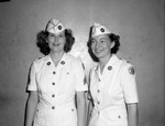 The Texas Guardettes are starting a drive for recruits. Leading the drive, left to right, are Virginia Jergins and Virginia Hagemeier. Depleted ranks are attributed to the return of husbands from overseas and the cutback in forces of various war plants. The Texas Guardettes are made up of young Fort Worth, Texas, women. The organization meets every Wednesday at the Armory. Duties of the Guardettes are to aid at the Service Men's Center and be subject to call at all times to help in civic organization programs. Miss Jergins is operating the organization's phones. Miss Hagemeier is heading the recruit drive. The women are dressed in their uniforms.