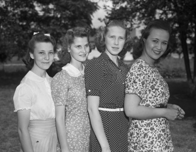 Four of the 23 candidates who will compete for selection as queen of Grapevine, Texas', sixth annual Cantaloupe Festival on June 28. The contestants are, left to right, Inez Hunter, Darline Jackson, Jean Buchanan and Margaret Stewart. They are standing outside. Miss Hunter is wearing a short sleeved blouse tucked into a pinstripe skirt. Miss Jackson is wearing a floral print dress with a lace-trimmed Peter Pan collar. Miss Buchanan is wearing a polka dot dress with a light colored braided belt at the waist. Miss Stewart is wearing a floral print dress.