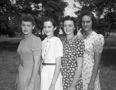 Four of the 23 candidates who will compete for selection as queen of Grapevine, Texas', sixth annual Cantaloupe Festival on June 28. The contestants are, left to right, Kathryn Estill, Hazel Champion, Anita Wilkerson and Mary Louise Hinds. They are standing outside. Miss Estill is wearing a solid colored dress with a high neckline and a belt of the same fabric with a bow in the middle. Miss Champion is wearing a light colored dress with dark buttons down the bodice and a belt at the waist. Miss Wilkerson is wearing a floral print dress and a multi-strand necklace. Miss Hinds is wearing a floral print dress and a chain necklace with several floral pendants. She is also wearing a watch on her left wrist.