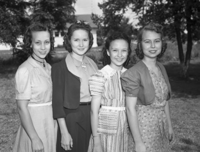 Four of the 23 candidates who will compete for selection as queen of Grapevine, Texas', sixth annual Cantaloupe Festival on June 28. The contestants are, left to right, Etha Bell Garrett, Ruth Walker, Barbara Boyd, and Helen Hall. They are standing outside. Miss Garrett is wearing a solid colored dress with a light colored belt at the waist, and a choker necklace. Miss Walker is wearing a checkered blouse tucked into a dark colored skirt and a blazer. The inside of the lapels of the blazer match the pattern of the blouse. She has a checkered bow in her hair. Miss Boyd is wearing a dress with a crochet detailed collar and a belt at the waist. The dress has light colored polka dots and multi-colored stripes running vertically down the bodice and skirt and horizontally on tgeh sleeves and front pockets on the skirt. Miss Hall is wearing a floral print dress and a shrug or bolero jacket. The contest will be held at Firemen's Park and newspaper reporters will be the judges.