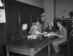 Selective Service Board Number 1. Left to right, D. A. Cowan, Doctor W. J. Danforth, Guy Price and Marvin Smith. The group of men are shown sitting at the end of a long table in a room. Each of the men are wearing suits and everyone, except Mr. Price, is wearing a pair of eyeglasses. The group appear to be looking through documents and discussing different matters. Both Danforth and Price are veterans of World War I. Behind them, file cabinets and a hat rack can be seen.