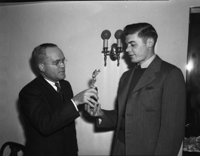 H. C. Burke Junior (left) is presenting a Little All-America trophy to Howard Young as part of an Award Luncheon. Young is a star Center on the Texas Wesleyan University football team and is the first Ram grid man to top the Williamson Rating System. Mr. Burke is dressed in a dark colored suit. Young is originally from Trinidad, Colorado. He is wearing a collared shirt, necktie, sweater, blazer, and trousers.