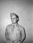 Army Private First Class Donnal Timmons of Levelland, Texas. Timmons is shown standing in front of an empty wall with his hands behind his back. He is wearing a military uniform and a pair of glasses as he looks to his right and smiles widely. Timmons was captured by the Germans during the Battle of the Bulge. Prior to entering the army, Timmons was a senior ministerial student at Baylor University.