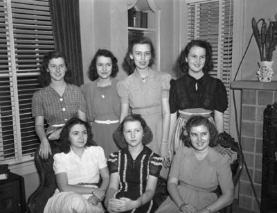 Phi Chi Psi sorority's new officers, who were installed at a miniature golf party given by Miss Betty Bechtol in their honor. Standing, left to right, are Martha Allen, historian, Betty Tomlinson, recording secretary, Sara Ann Hyde, treasurer, and Jana Morrison, reporter. Seated, left to right, are Rosemary Schabarum, vice president, Elaine Shifflett, pledge mistress, and Nina Elliott, president. All the officers are wearing dresses.
