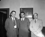 Young Men's Christian Association Secretaries. Conference. Left to right: S. J. Schreiner, Roy W. Niswonger of Dallas, Texas, and Paul S. Hayward, of Fort Worth, Texas.The trio of men are shown standing next to each other with either their hands behind their back or clasped in front of them. The men are dressed in double-breasted suits with patterned ties. Behind them is a wall with a framed picture hanging and an open door.