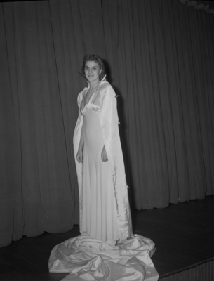 Charlotte Boyd of Childress, Texas is the Texas Wesleyan University May Queen. Miss Boyd is a senior and majoring in physical education. Her official coronation will take place at the annual T. W. C. homecoming in May. She is shown posing on a stage, wearing a gown with a long cape. Miss Boyd is the daughter of Mr. and Mrs. C. F. Boyd.