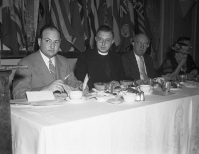 Some of the speakers and attendees at the appreciation dinner held at Hotel Texas in honor of Henry Love, manager of the hotel. Seated at a dining table are, left to right, Frank Crumley, master of ceremonies and general chairman of arrangements, Reverend A. Schmitt, and William Monnig. Behind them are several flags lined up against the wall. Mr. Crumley is wering a suit and necktie. Reverend Schmitt is wearing his clergy clothing. Mr. Monnig is wearing a suit, necktie and eyeglasses.