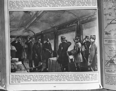 Copy of a drawing from "The War of the Nations," printed by the New York Times. The drawing is of meeting of French and German delegates on November 11, 1918, in the railway coach of Marshal Foch of France to agree on armistice terms. The Allied representatives were, left to right, General von Gundell, General von Winterfeldt, Mathias Erzberger, Count von Oberndorff, British Admiral Wemyss, Marshal Foch, an American delegate, and General Weygand. Text beneath the drawing says: "This drawing of the first meeting of the German armistice delegates with Marshal Foch and allied associates in the Marshal's railroad car at Rethondes, France, was made by an artist especially assigned by the French Government for that purpose. The allied representatives are (1) Marshal Foch, (2) British Admiral Wenyss, (3) an American delegate, probably General Rhodes, (4) French General Maxime Weygand. The German delegates are (5) Mathias Erzberger, (6) General von Guendell, (7) General von Winterfeld, and (8) Count con Oberndorff. Marshal Foch read the terms in a loud, clear voice. Conference followed, and the terms were signed Nov. 11, 1918."
