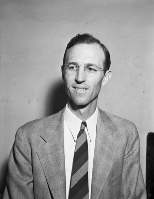 Reverend Thomas L. Massie, new director of religious education at First Christian Church. He is a Texas Christian University (T. C. U.) graduate of 1928. He succeeds Reverend Arthur Fleming, who is now a pastor in Crescent, Oklahoma. Reverend Massie is shown standing in front of a blank wall. He is wearing a suit, a striped necktie and eyeglasses.