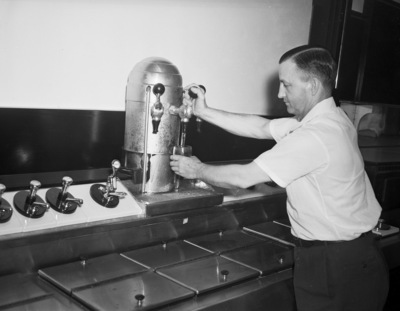 Interior shot of the new S. & T. Bowling Center, owned and managed by Jack Tavener. Mr. Tavener is shown drawing a soft drink from the new streamlined fountain. He is wearing a short-sleeve collared shirt and trousers.