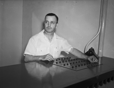 Interior shot of the new S. & T. Bowling Center, owned and managed by Jack Tavener. Mr. Tavener is shown testing some of the lights in the building from the control board on the back of the front counter. He is wearing a short-sleeve collared shirt. Also on the counter is a telephone.