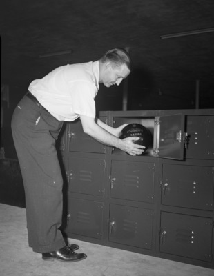 Interior shot of the new S. & T. Bowling Center, owned and managed by Jack Tavener. Mr. Tavener is shown placing a bowling ball inside one of the private lockers in the building. He is wearing a short-sleeve collared shirt and trousers. The bowling ball was manufactured by the Brunswick Corporation. Inscription on the bowling ball reads, "Brunswick Mineralite 32280."