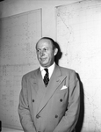 Jack Danglade is an independent oil operator from Lovington, New Mexico. He is visiting Fort Worth, Texas, on business. He served in a wartime civilian post for which he received the highest civilian citation, the Distinguished Civilian Service Award. He held the Navy post for three years, negotiating and procuring oil for military use. Mr. Danglade is shown standing in front of a map. He is dressed in a double breasted suit.
