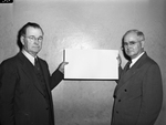 The Community War Chest is kicking off their 1945 campaign, asking Fort Worth, Texas, residents to "give gratefully." Participating in the campaign, left to right, are C. W. Wofford and Homer Covey. Their goal is $590,364. Mr. Wofford is the chairman of the employees' division. He is wearing a three-piece suit. Mr. Covey is co-chairman of the general drive. He is wearing a double-breasted suit. The men are holding a blank piece of paper between them.