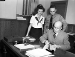 Mayor Roscoe L. Carnrike is dotting the last "i" to make the week of October 14-20 officially Community War Chest Week. The young citizens backing the Mayor, left to right, are Eileen Buckmaster and Roy Kelley. Mayor Carnrike is wearing a three-piece suit. Miss Buckmaster is with the Camp Fire Girls. Mr. Kelly is the highest ranking Boy Scout in the Fort Worth, Texas, area. Both are dressed in their respective uniforms.