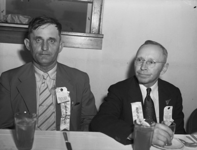 Attending the second annual meeting of the Permian Basin Association at Odessa, Texas, were, left to right, Jim Griffin, of Odessa, Texas, chairman of the finance committee of the association, and A. H. Dennison, Ector County, Texas, judge. They are sitting at a dining table. Both men are wearing suits and neckties. Mr. Dennison is wearing eyeglasses. Each has a ribbon pinned to their suit jacket that reads, "Reception," as well as a name tag.