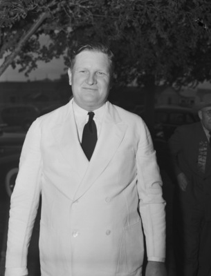 C. C. Thompson, of Colorado City, Texas, was re-elected vice president of the Permian Basin Association at the second annual meeting of the association at Odessa, Texas. He is standing outside, wearing a double-breasted suit and a necktie. Behind him are several trees and another convention attendee.