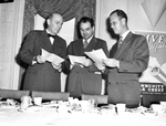 The Community War Chest is kicking off their 1945 campaign, asking Fort Worth, Texas, residents to "give gratefully." Participating in the campaign, left to right, are J. B. Thomas, W. H. "Bill" Wright, and W. C. Mayer. They are attending the opening banquet at the Hotel Texas. Mr. Thomas is chairman of advance gifts. He is wearing a double-breasted suit with a bow tie. Mr. Wright is co-chairman of the employee division. He is dressed in a three-piece suit. Mr. Mayer is chairman of the drive publicity. He is wearing a double-breasted suit. The campaign is driving toward a goal of $590,364.