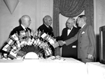 The Community War Chest is kicking off their 1945 campaign, asking Fort Worth, Texas, residents to "give gratefully." Participating in the campaign, left to right, are William Monnig, Captain Leonard J. Dow, Homer Covey, and Ed Parker. They are attending the opening banquet at the Hotel Texas. Mr. Monnig is standing behind the Allied flag display, dressed in a suit. Captain Dow is the commanding officer of the Naval Air Station at Grand Prairie, Texas, and a veteran of the Pacific. He is dressed in a dark suit. Mr. Covey is co-chairman of the general drive. He is wearing a double-breasted suit with a bow tie. Mr. Parker is dressed in a double-breasted suit.