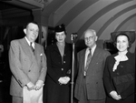 The Community War Chest is kicking off their 1945 campaign, asking Fort Worth, Texas, residents to "give gratefully." Participating in the campaign, left to right, are Paul Moon, Ida Spiess, Doctor C. A. Hickman, and Mrs. Carrie L. Ferree. Their goal is to raise $590,364. Mr. Moon is a division chairman of construction. He is wearing a double breasted suit. Miss Spiess is with personal services. She is dressed in a hat, blazer, and a skirt. Mr. Hickman is with the hotels. He is wearing an open double breasted suit. Miss Ferree is reporting for County Judge Craft. She is wearing a hat, scarf, and blazer.