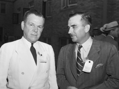 Attending the second annual meeting of the Permian Basin Association at Odessa, Texas, were, left to right, Harry Wiess, of Houston, Texas, president of the Humble Oil and Refining Company, and John W. House, of Midland, Texas, division superintendent of Humble Oil Company. They are standing outdoors, both wearing suits and neckties. Each has a name tag pinned to their suit jacket.