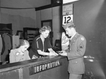 Staff Sergeant Tony Rapaciewicz, right, checking in at the information desk at the Service Men's Center. Mrs. Belle Robertson, standing behind the counter, center, and Mrs. Alicia White, seated, left, register Sergeant Rapaciewicz for a night's lodging at the center. Sergeant Rapaciewicz is wearing his military uniform.