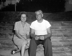 Female golfers throughout the country are gathering for the upcoming Women's Texas Open Golf Tournament. The tournament will be held at the Colonial Country Club, in Fort Worth, Texas. Preparing for the tournament are Mr. and Mrs. H. T. Williford, of San Antonio, Texas. The couple is sitting on the stone steps leading to the clubhouse. Mrs. Williford is wearing a checkered button-up dress and golf cleats. Mr. Williford is dressed in a t-shirt and trousers.