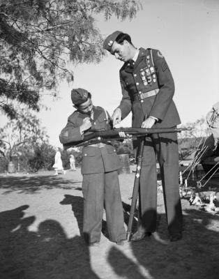 Camp Dallas. Reserve Officer's Training Corporation encampment. Dan Yarbrough Junior seen being taught how to use a gun by Warren Melton, the shortest and tallest, respectively, soldiers in the encampment. Both are from Arlington Heights High School.