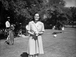 Female golfers throughout the country are gathering for the upcoming Women's Texas Open Golf Tournament. The tournament will be held at the Colonial Country Club, in Fort Worth, Texas. Preparing for the tournament is Miss Margaret Gunther of Memphis, Tennessee. She is a two-time champion. She holds the Tennessee State Championship and recently won the Fort Smith, Arkansas, Invitation. She is wearing a polka-dot blouse and a skirt. A caddie is standing at the left in the background.