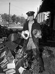 City Fireman O. J. McAlister holding two candy boxes from the fire-devastated Pangburn Candy building.