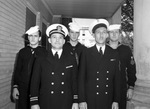 Official closing of the V-12 Navy College Training Program participants (left to right) E. J. Guise, Store Keeper 2-C; Lieutenant C. M. Schmidt, Unit Commander; R. W. Brotherton, Pharmacist's Mate 1-C, G. W. Gillette, Chief Yoeman, and N. T. Carley, Specialist First Class.