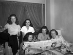 Texas Woman's University (T. W. U.) "Lasso" newspaper staff include (left to right) Billie Walker, Midland, Texas; Jane O;Neal, Lubbock, Texas; Vicki Moran, Fort Worth, Texas; and Jennilou Grammer, Coleman, Texas. Sitting on the floor is Adelle Baker, Fort Worth, Texas, Lasso editor.