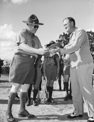 From left to right is A. J. Fulkerson and Ed Landreth with the Boy Scouts at Worth Ranch. The two men appear to be exchanging a plaque or clipboard. There are younger scout members standing behind the two men.